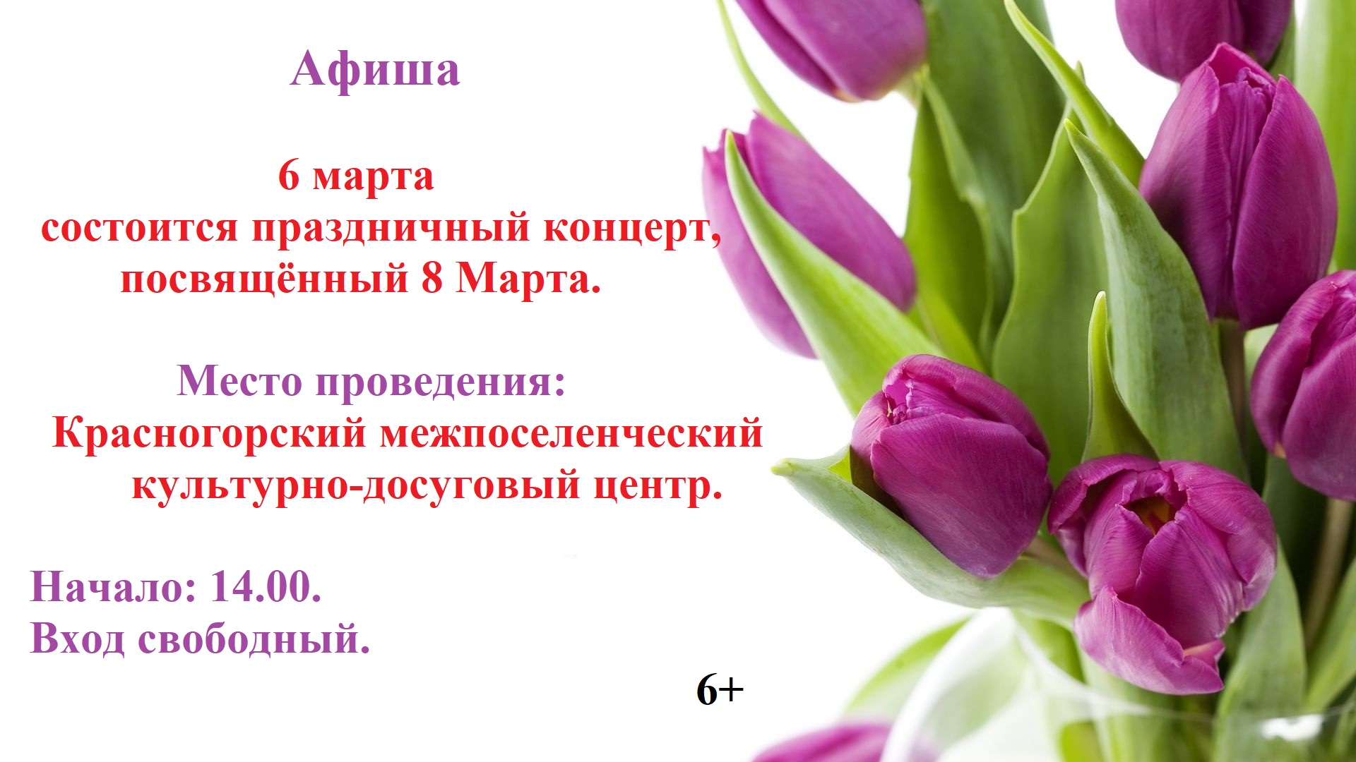 6 марта состоится праздничный концерт, посвящённый 8 Марта. Место проведения: Красногорский ...