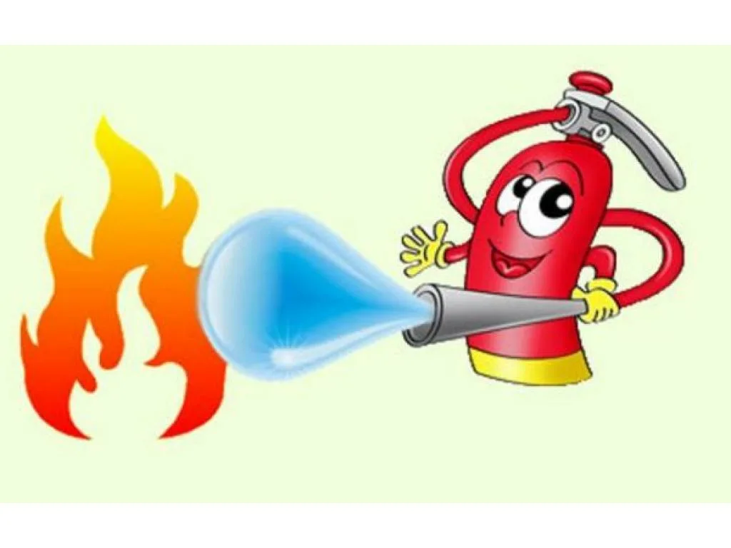 - В каждом классе есть огнетушитель. Необходимо научиться им пользоваться. Как использовать огнетушитель: сорвать пломбу, выдернуть чеку, направить раструб на пламя, нажать на рычаг.