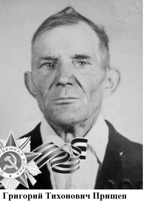 — Мой дедушка Григорий Тихонович Прищеп родился в 1908 году в с. Яловка. 3 октября 1943 года призван по мобилизации Красногорским РВК на борьбу с фашистскими захватчиками, а дома остались его ждать жена и четверо детей. С 3 октября 1943-го по 15 марта 1945 года в Великую Отечественную войну был младшим сержантом в составе 624 стрелкового ордена Кутузова полка 137 стрелковой Бобруйской ордена Суворова дивизии 48 армии. А с 15 марта по 9 мая 1945 года был командиром и наводчиком орудия 45-мм противотанковой пушки 220 стрелкового полка. Участвовал в операциях по освобождению Белоруссии и Украины. В трудном бою 1 декабря 1943 года был тяжело ранен при освобождении Украины от гитлеровских захватчиков. Родным ошибочно пришла похоронка, что погиб в бою и похоронен в д. Головеньки Черниговской области в Виноградном саду. Но, к счастью, дедушка оказался жив. Его отправили на лечение в Тульский военный госпиталь. После госпиталя мой дедушка продолжил воевать с фашистами и Победу встретил в Берлине. За личное мужество и отвагу в боях с врагами Советского Союза дедушка дважды награждён высшей советской медалью «За отвагу»: за тяжёлое ранение в бою и взятие «языка». В соответствии с Указом Президиума Верховного Совета СССР от 25 апреля 1975 года награждён юбилейной медалью «Тридцать лет в Великой Отечественной войне 1941-1945 гг.» и юбилейными медалями «50 лет Вооруженных сил СССР» и «60 лет Вооруженных сил СССР». Демобилизовавшись, на основании Указа президиума Верховного Совета СССР от 25.10 1945 года, дедушка работал в сельском хозяйстве, в родном совхозе «Правда» до 1981 года, был учётчиком. За добросовестный труд неоднократно был награждён грамотами и ценными подарками. Также искусно плёл из лозы плетни, корзины, кошёлки и кошы для перевозки и переноски свеклы для крупного и мелкого скота животноводческой фермы. Умело своими руками на всю округу по просьбе людей шил из овчины полушубки (кожухи) для взрослых и детей. Даже в военном билете отмечено, что он портной.