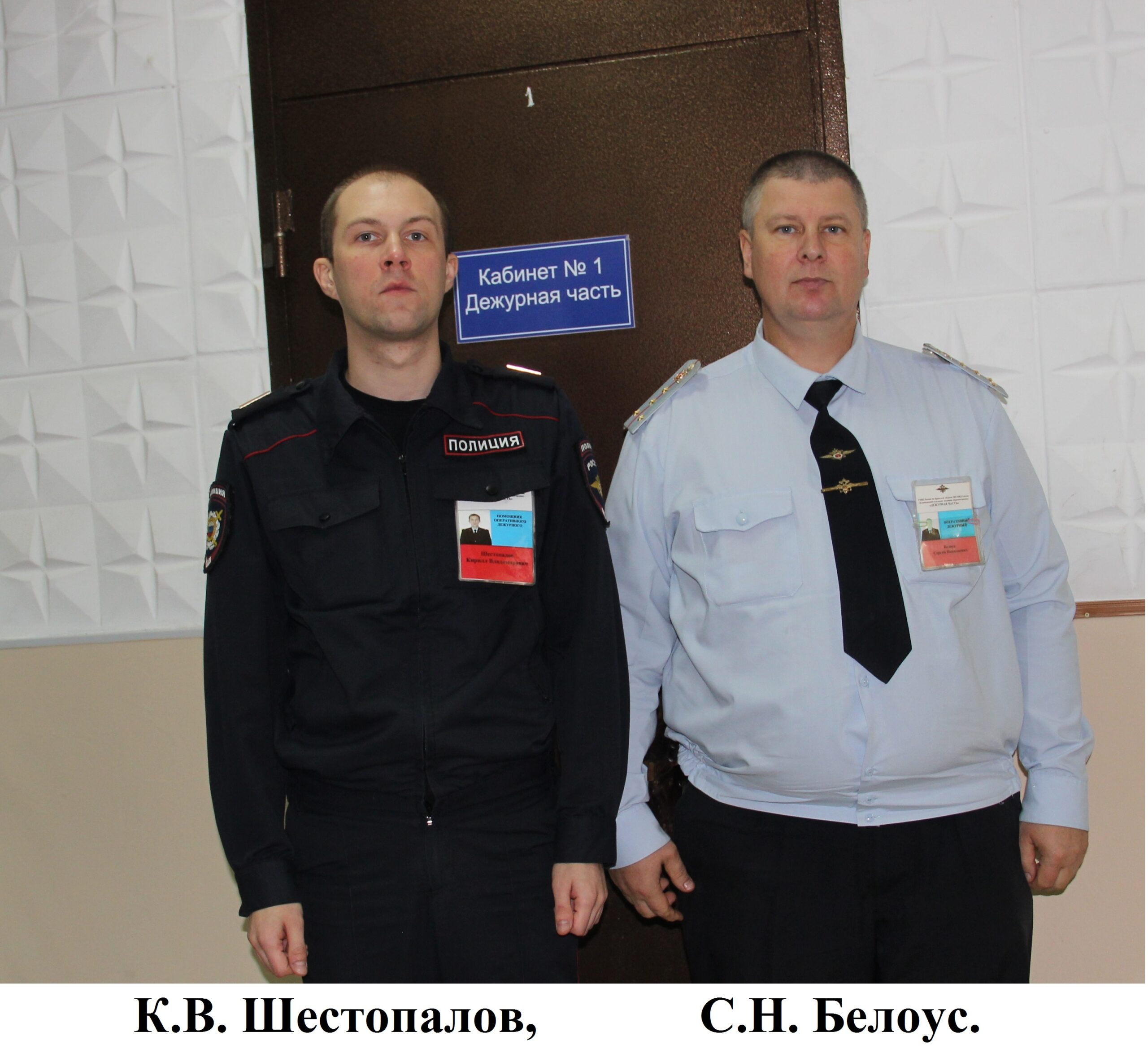 Дежурная часть отделения полиции как горячая точка: телефон может зазвонить в любое время суток, независимо будний это день или выходной. И на каждый звонок, а также заявление, обращение сотрудники полиции обязаны отреагировать. В момент нашего посещения отделения полиции «Красногорское» службу несли оперативный дежурный капитан полиции С.Н. Белоус и помощник оперативного дежурного старшина полиции К.В. Шестопалов . Все сотрудники дежурной части имеют большой стаж службы, так у Сергея Николаевича – 24 года, у Кирилла Владимировича – 10 лет. Накопленный опыт помогает сотрудникам этого подразделения правильно выстроить диалог с любым человеком, который обращается за помощью, быстро оценить полученную информацию и оперативно скоординировать работу всех, кого нужно подключить к делу.