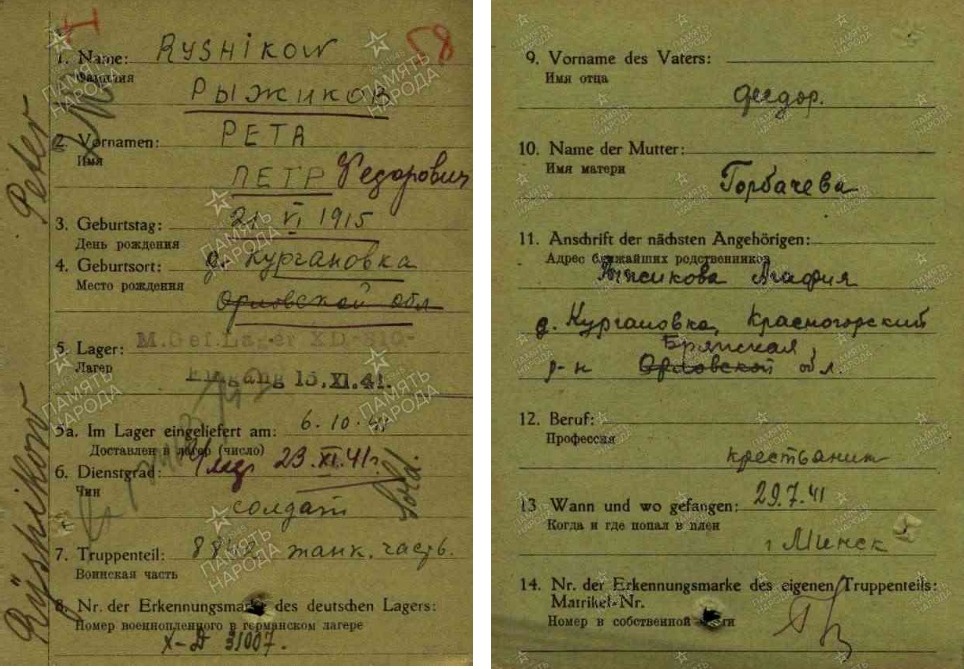 В карте военнопленного лагерный писарь внёс его ошибочно как Рыжиков, однако данные с карты военнопленного (адрес, ФИО жены) совпали с данными пропавшего без вести.