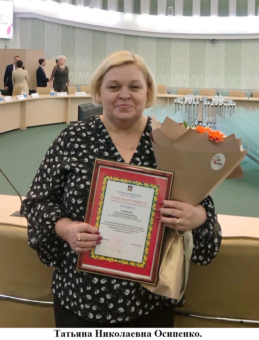 В число награждённых вошла оператор компьютерного набора ГБУ «Редакция газеты «Красногорская жизнь» Татьяна Осипенко. За многолетний, добросовестный труд ей была вручена Почётная грамота Губернатора Брянской области. Татьяна Николаевна начала свой трудовой путь в редакции в 2005 году. За проработанные 19 лет зарекомендовала себя ответственным, исполнительным, грамотным сотрудником. Постоянно повышая свой профессиональный уровень, добивается значимых результатов в выполнении своих должностных обязанностей. Ей присущи оперативность, аккуратность, организованность, чувство стиля, что немаловажно при вёрстке газеты. Имея немалый трудовой опыт, она хорошо владеет компьютерными программами, в которых работает, а, верстая очередной номер газеты, может чётко представить макет того, как будет выглядеть уже готовое издание. Эта доброжелательная, миловидная женщина, кроме профессиональных качеств, обладает и дружелюбным характером, общительна, отзывчива, пользуется уважением в коллективе.