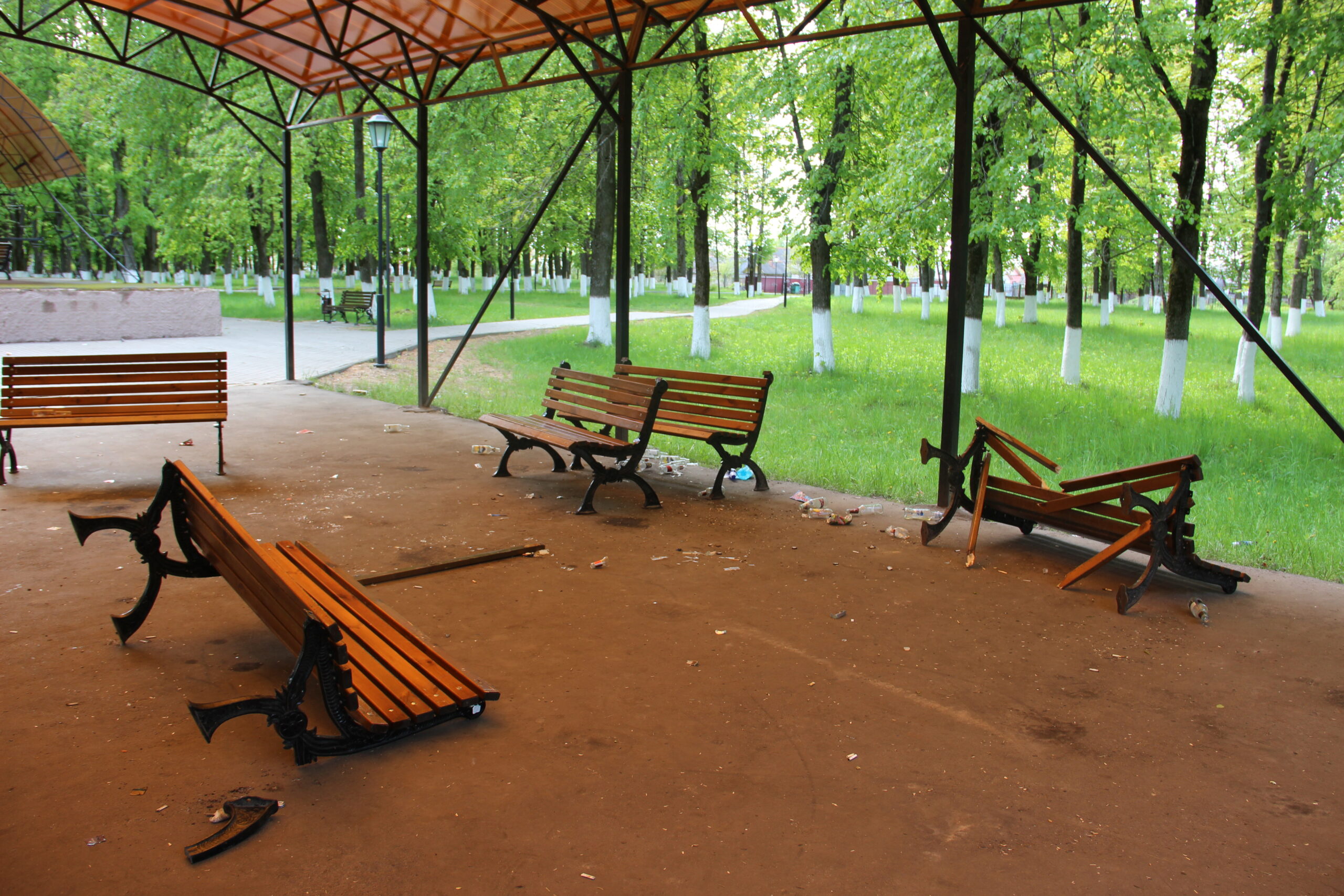 Мы выехали туда. У каждого добропорядочного человека эти снимки вызовут, без сомнения, соответствующую реакцию на действия вандалов, совершивших порчу скамеек с особой жестокостью. Скамейки, предназначенные для посещающих парк людей, чем-то не угодили разнузданным хулиганам, которые здесь сами же «культурно отдыхали». Видно под «парами» принятых напитков появилась недюжинная силушка, и не для доброго дела, а для того, чтобы сломать, сокрушить то, что исправно служит и гуляющим здесь мамам с колясками, и маленьким детям, и пожилым, и другим людям с культурным стержнем. Время расставит всё по местам, и разрушителям рано или поздно придётся ответить за свои деяния. А задуматься над тем: «Где и как по вечерам гуляют мои домочадцы?» должны в каждой семье.
