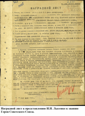 А в общей сложности не самый длинный, чуть более полутора лет, но очень яркий боевой путь И.Н. Лысенко, помимо звания Героя Советского Союза и ордена Ленина, отмечен орденами Отечественной войны I и II степеней, Красной Звезды, Славы III степени, медалью Жукова, медалями «За отвагу», «За освобождение Варшавы», «За взятие Берлина», «За победу над Германией».