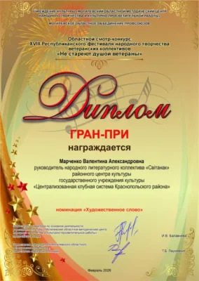Дипломом Гран-при отмечен уровень мастерства художественного чтения Валентины Марченко, руководителя народного литературного коллектива «Світанак», которая прочла своё стихотворение «Поле». Оно о тяготах войны, наших горьких потерях и несокрушимой воли нашего народа. 85 лет прошло с начала Великой Отечественной войны, а наша Память хранит всё.