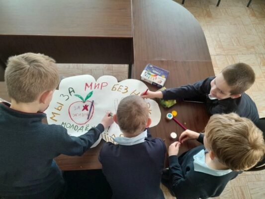 Акция-плакат «Молодёжь против наркотиков» прошла в детской библиотеке с постоянными читателями — учениками 3-го класса. Мальчишки с удовольствием работали красками, создавая своими руками плакат, через который выразили свое отношение к здоровому образу жизни.